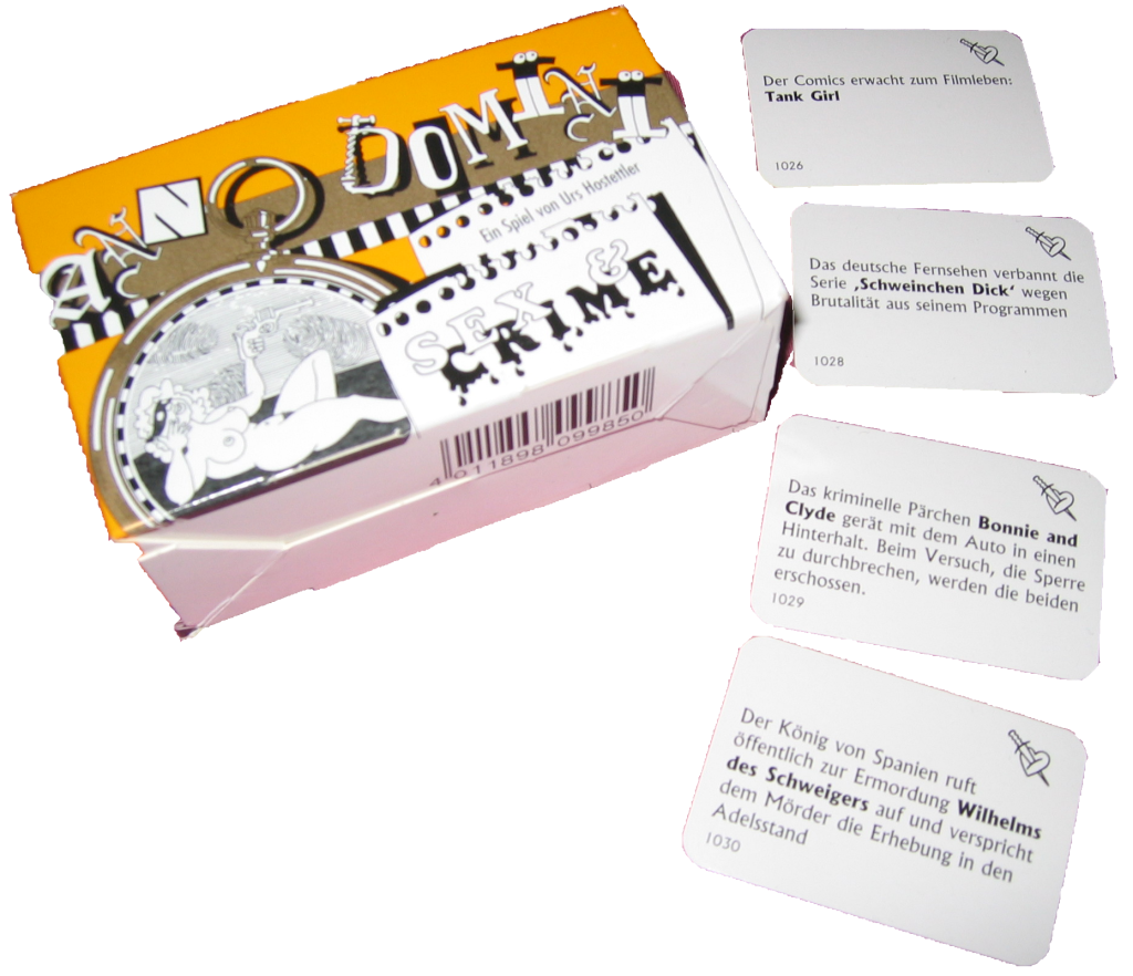 Bei Anno Domini – Sex & Crime müssen 2–8 Historiker Ereignisse der Kriminalgeschichte in die richtige chronologische Reihenfolge bringen. Mogeln wird – ebenso wie falsches Verdächtigen – durch Punktabzug bestraft. Eine Runde dauert bis zu 1 Stunde. (Verena)