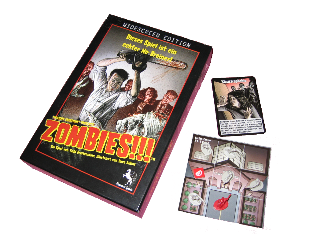 Bei Zombies müssen sich 2–6 Überlebende mit Hilfe von Schrotflinten, Feuerwehräxten und Kettensägen den Weg durch eine beständig wachsenden Armee von Untoten bahnen. Unterwegs findet man Munition, Verbandmaterial und bessere Waffen. Es gewinnt derjenige Spieler, der zuerst 25 Zombies tötet oder als erster den rettenden Hubschrauber erreicht. Von den lieben Mitspielern initiierte Panikattacken oder Gehirnkrämpfe machen einem dabei das Leben schwer. Bei der idealen Anzahl von 3 oder 4 Spielern dauert ein Spiel 2–3 Stunden, bei mehr Spielern zieht es sich etwas. (Phrank)