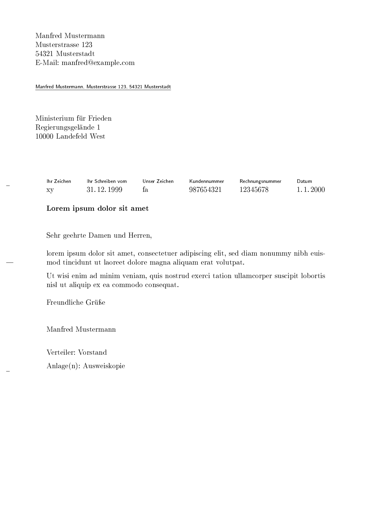 anschreiben.tex\documentclass[mustermann, parskip=half]{scrlttr2} \usepackage[ngerman]{babel} \begin{document} \begin{letter}{Ministerium für Frieden\\ Regierungsgelände 1\\ 10000 Landefeld West} \setkomavar{date}{1.\,1.\,2000} \setkomavar{subject}{Lorem ipsum dolor sit amet} \opening{Sehr geehrte Genossinen und Genossen,} lorem ipsum dolor sit amet, consectetuer adipiscing elit, sed diam nonummy nibh euismod tincidunt ut laoreet dolore magna aliquam erat volutpat. Ut wisi enim ad minim veniam, quis nostrud exerci tation ullamcorper suscipit lobortis nisl ut aliquip ex ea commodo consequat. \closing{Freundliche Grüße} \cc{Vorstand} \encl{Ausweiskopie} \end{letter} \end{document}