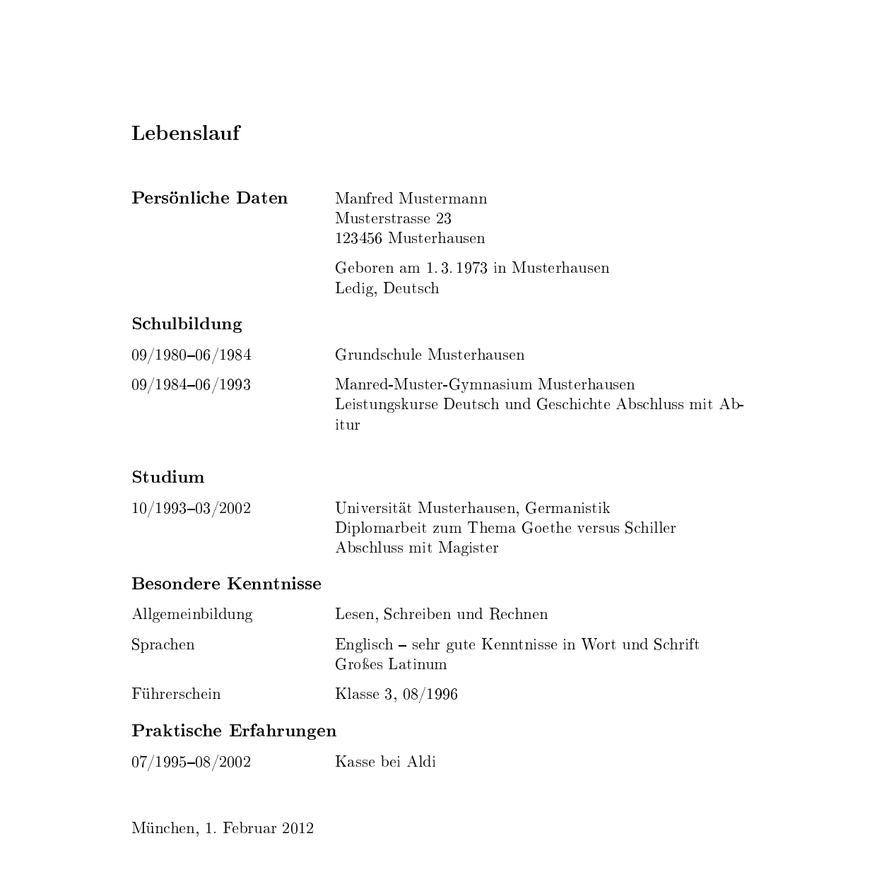 lebenslauf.tex\documentclass{scrartcl} \usepackage[ngerman]{babel} \usepackage{currvita} \begin{document} \setlength{\cvlabelwidth}{45mm} \begin{cv}{Lebenslauf} \begin{cvlist}{Pers"onliche Daten} \item Manfred Mustermann\\ Musterstrasse 23\\ 123456 Musterhausen \item Geboren am 1.\,3.\,1973 in Musterhausen\\ Ledig, Deutsch \end{cvlist} \begin{cvlist}{Schulbildung} \item[09/1980--06/1984] Grundschule Musterhausen \item[09/1984--06/1993] Mia-Muster-Gymnasium Musterhausen\\ Leistungskurse Deutsch und Geschichte Abschluss mit Abitur\\ \end{cvlist} \begin{cvlist}{Studium} \item[10/1993--03/2002] Universität Musterhausen, Mustererkennung\\ Diplomarbeit zum Thema Karos versus Streifen\\ Abschluss mit Magister \end{cvlist} \begin{cvlist}{Besondere Kenntnisse} \item[Allgemeinbildung] Lesen, Schreiben und Rechnen \item[Sprachen] Englisch -- sehr gute Kenntnisse in Wort und Schrift\\ Großes Latinum \item[Führerschein] Klasse 3, 08/1996 \end{cvlist} \begin{cvlist}{Praktische Erfahrungen} \item[07/1995--08/2002] Kasse bei Aldi \end{cvlist} \cvplace{München} \end{cv} \end{document}